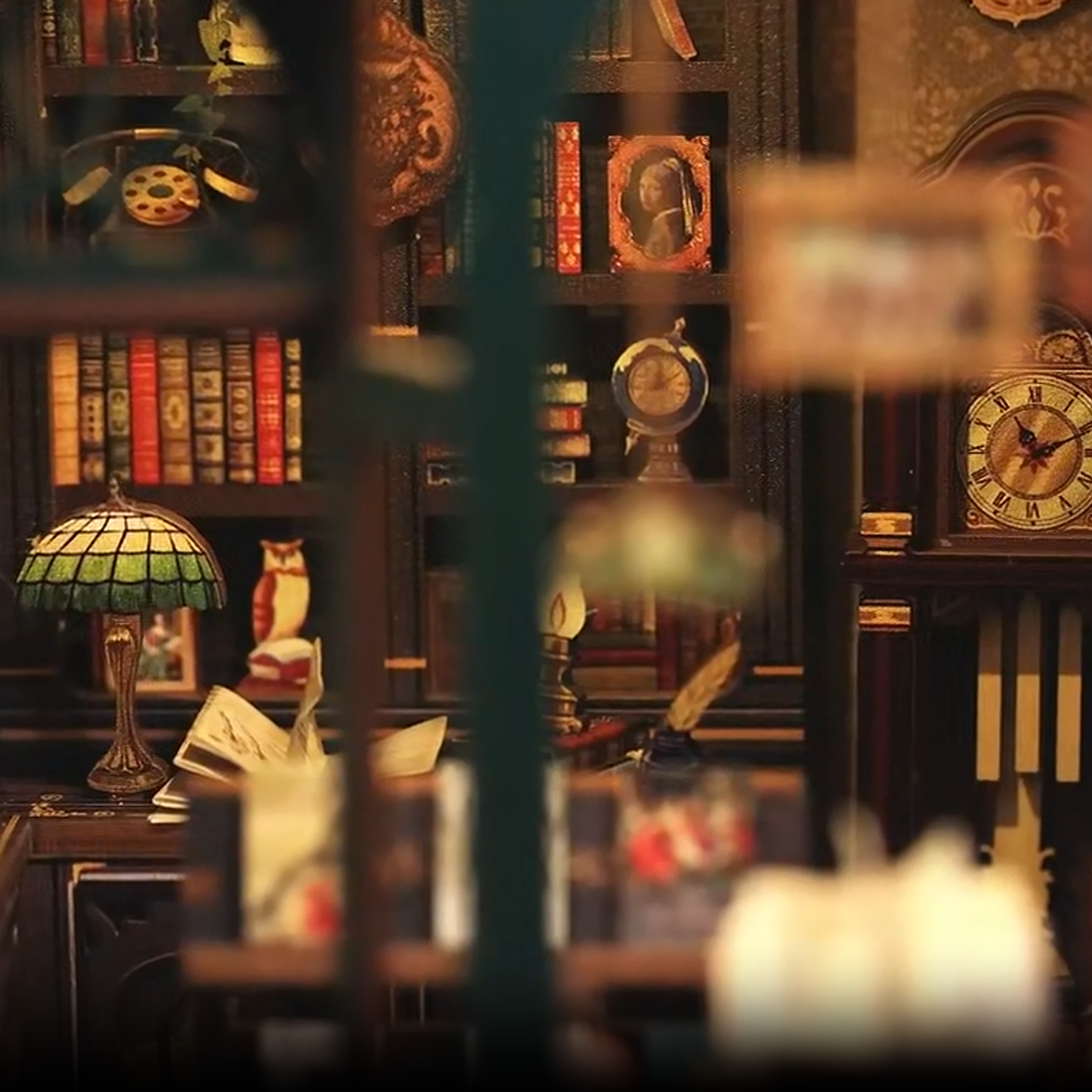 Open de houten deur en stap terug in de tijd in deze charmante Engelse boekhandel uit de vorige eeuw. Deze nostalgische book nook ademt de geur van oude boeken, houten boekenkasten en warme gaslampen. Door de zachte, warme verlichting zie je elk doordacht detail: de goudbedrukte ruggen, de oude telefoon, en zelfs een echte Tiffany's lamp!